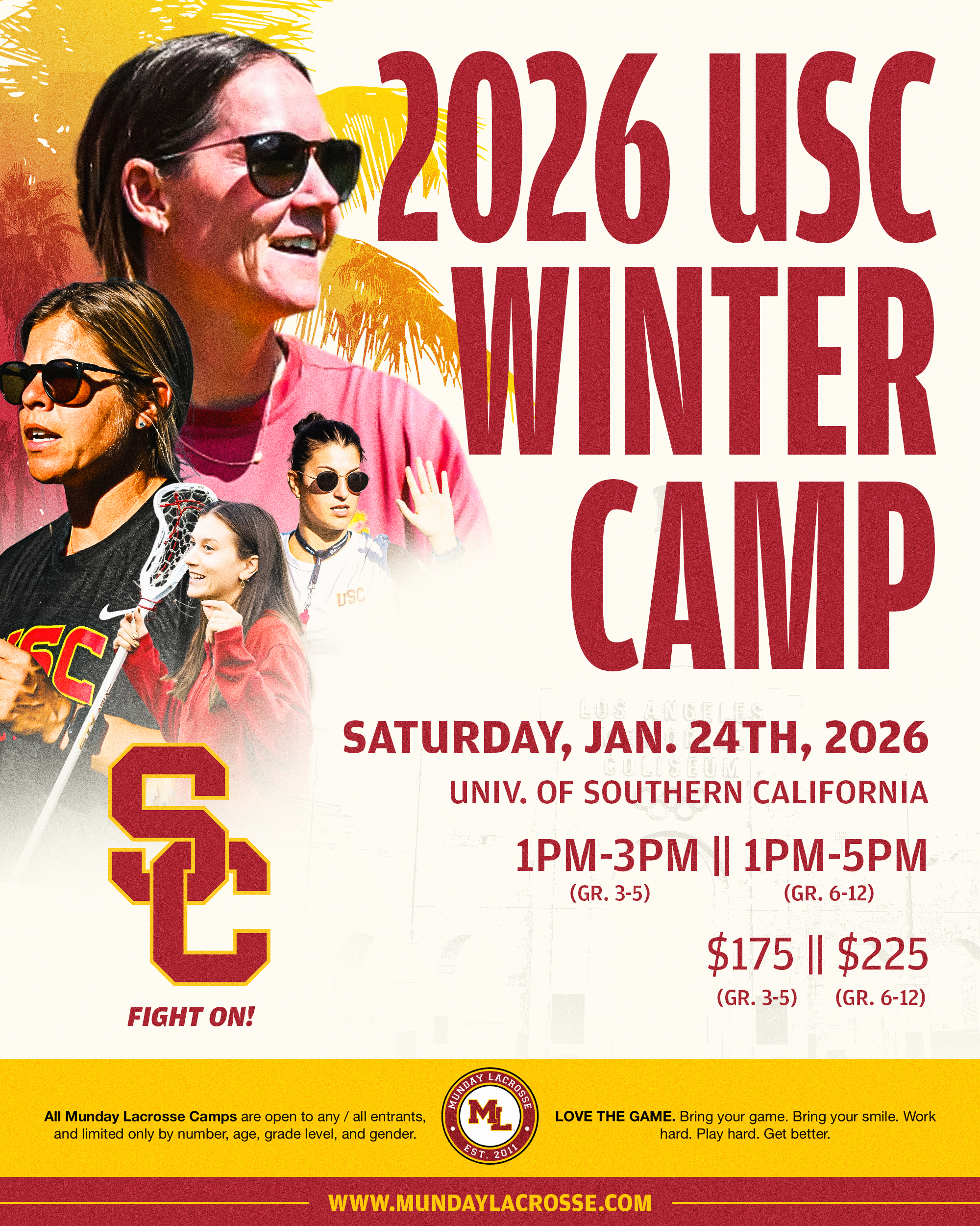 This is a youth and high school training event developed by Coach Lindsey Munday and the USC Staff to maximize growth and education for all lacrosse players. Training sessions focus on shooting, dodging, agility training, passing, defense, communication, and lacrosse IQ development.